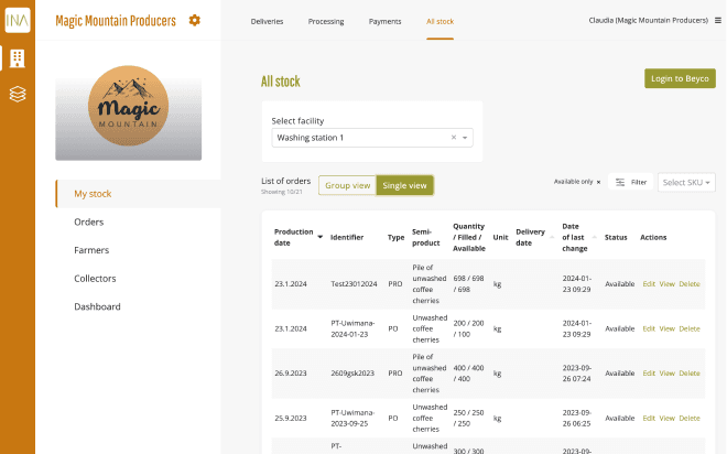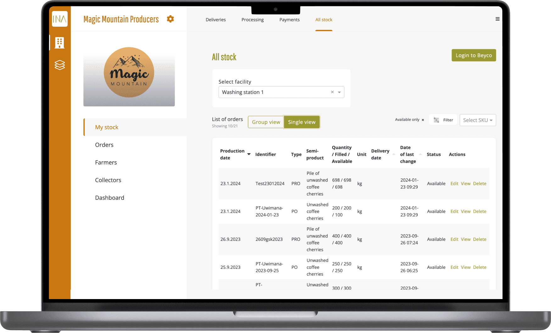 INATrace Pro includes many features such as tracking of farmers’ deliveries of raw materials, stock management, production and processing data, quality control, order management, and accounting. These are popular features, especially among agriculture production organizations. These features provide incentive for your suppliers to start using the system so that they can easily identify and overcome existing challenges, improving traceability and increasing the efficiency of their processes.